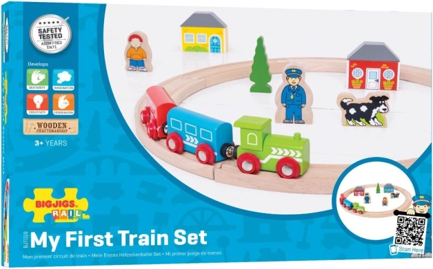 Objevte kouzlo prvních jízd s touto barevnou dřevěnou vláčkodráhou od BIGJIGS RAIL. Sada obsahuje 19 dílů včetně lokomotivy, vagonků, magnetických spojek a doplňků jako domy, stromy a postavičky. Vhodná pro děti od 3 let, podporuje představivost, jemnou motoriku a koordinaci. Vyrobeno z kvalitních, zodpovědně získaných materiálů a kompatibilní s většinou dřevěných vláčkodrah na trhu.