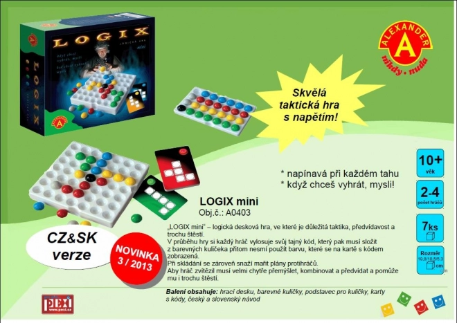 V ALEXANDER LOGIX Mini se každý hráč snaží co nejrychleji zkonstruovat svůj tajný kód podle vylosované karty. Přidáváním, odebíráním a výměnou barevných kuliček na prostorové desce vytváříte vzory, které vás přiblíží k vítězství, a zároveň šikovně blokujete soupeře. Rychlá kola, jasná pravidla a napětí až do posledního tahu dělají z LOGIX Mini výbornou volbu pro společné večery.
