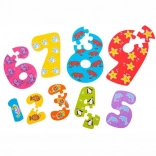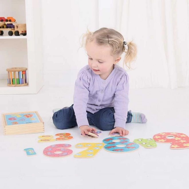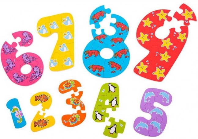 Tato sada vzdělávacích puzzlí učí děti rozpoznávat číslice a přiřazovat k nim množství. Každé číslo se skládá z odpovídajícího počtu dílků (např. číslo 4 má čtyři dílky) s veselým zvířecím motivem, což podporuje přirozené učení i radost ze skládání.