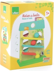 Dřevěný kaskádový domeček VILAC nadchne malé děti svou zábavnou jízdou míčků a líbivým designem. Nabízí 3 rampy na obou stranách, po kterých se dřevěné míčky kutálejí shora dolů a při dojezdu do cíle zazvoní kovový zvoneček. Hračka v pastelových barvách rozvíjí zručnost i logické myšlení a poskytne hodiny radostné hry.