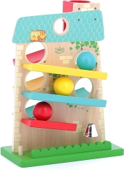 Objevte kouzlo pohybu a zvuku s kaskádovým domečkem VILAC. Díky promyšlené konstrukci se míčky plynule pohybují ze strany na stranu po třech rampách a končí cinknutím kovového zvonečku, které děti milují. Odolné zpracování ze dřeva a kovu zajišťuje dlouhou životnost i bezpečnou hru.