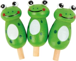 Barevná dřevěná deska ve tvaru žáby s květinami a broučky motivuje ke hře a podporuje představivost. Díky přehlednému rozložení otvorů se děti snadno zorientují.