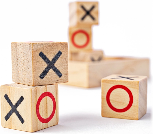 - 9 hracích kamenů (X a O), dřevěná úložná základna