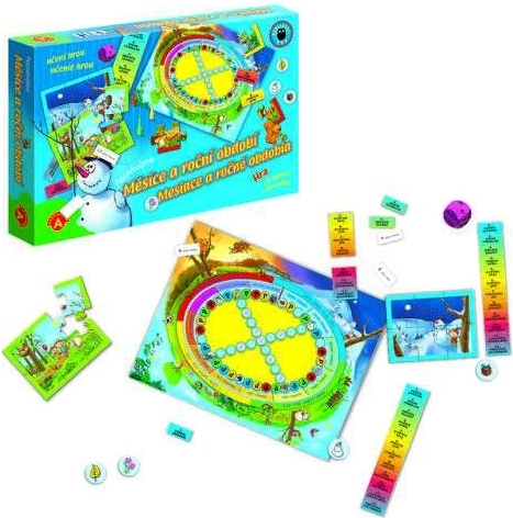 - Herní plán, 4 figurky, hrací kostka, kartičky měsíců (4×12), kartičky dnů (7), puzzle (4×6), 8 žetonů, CZ/SK návod