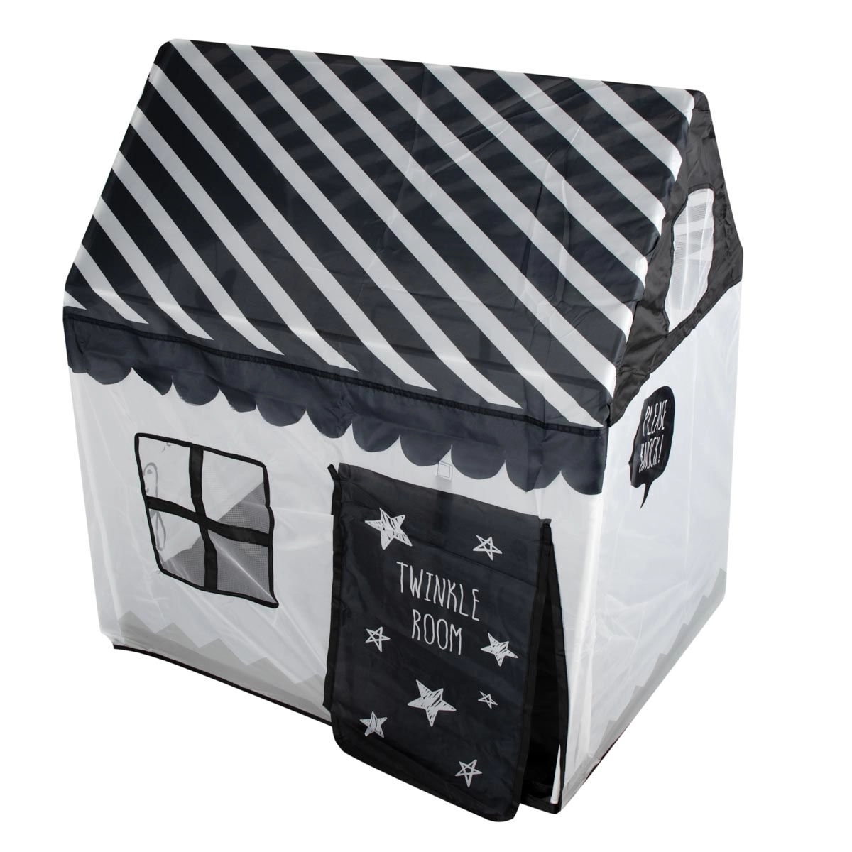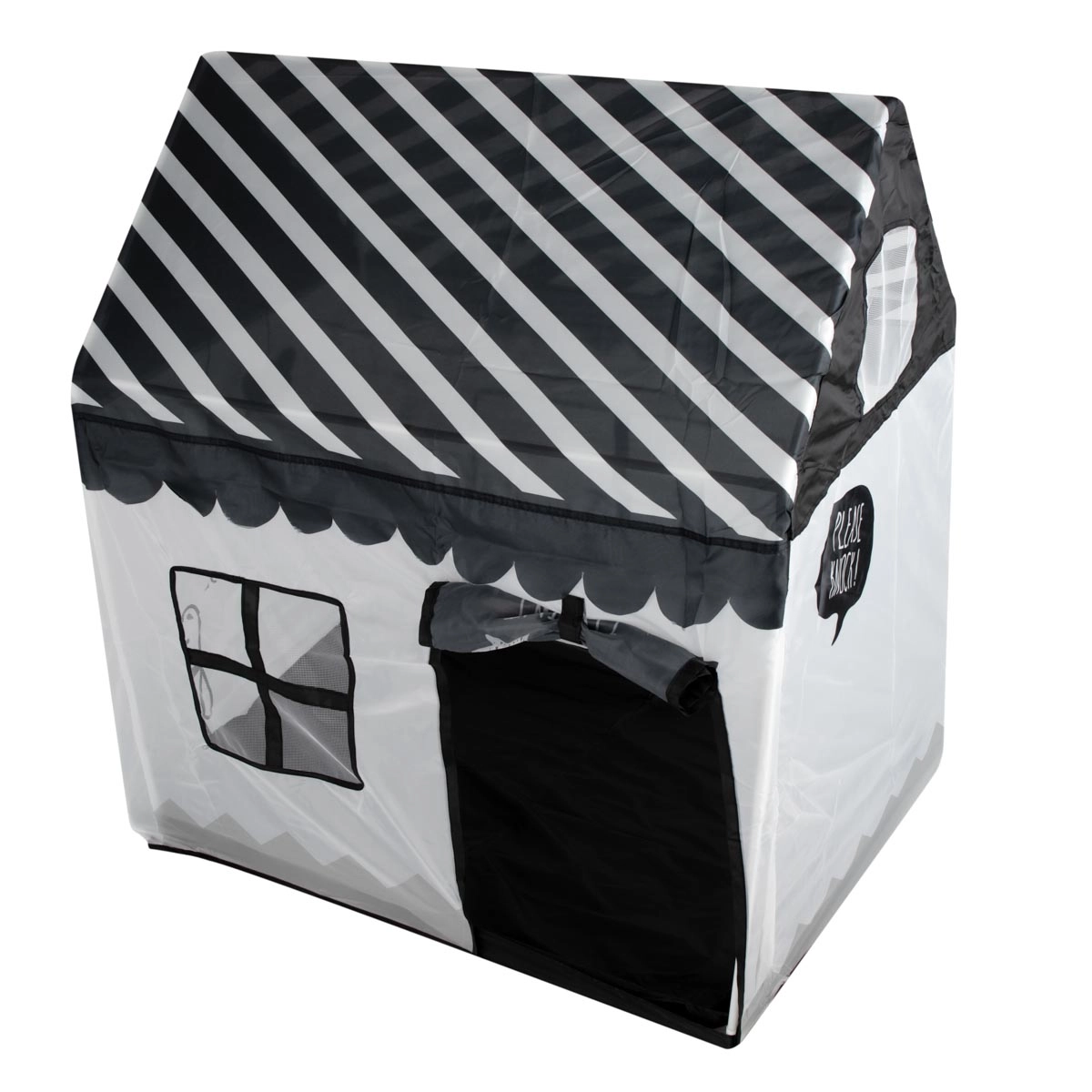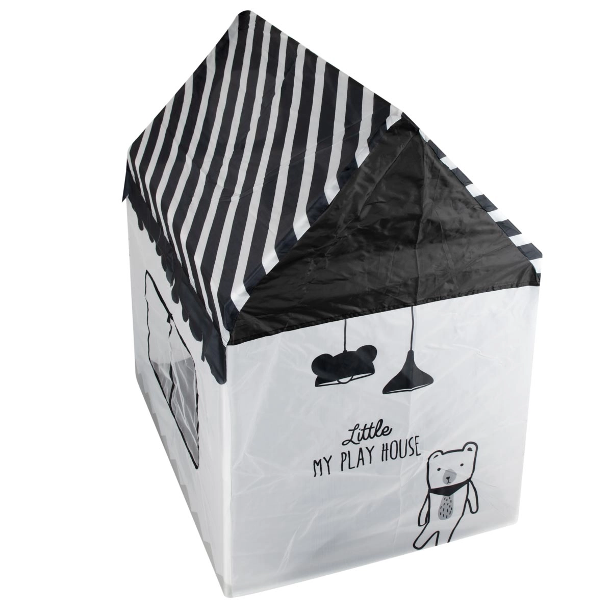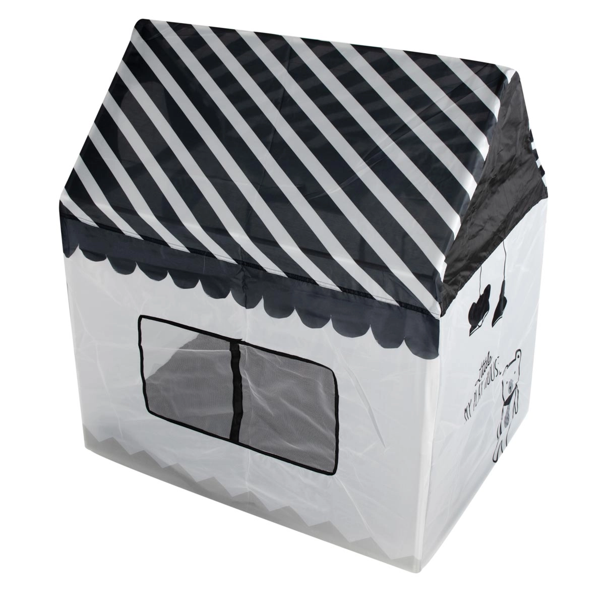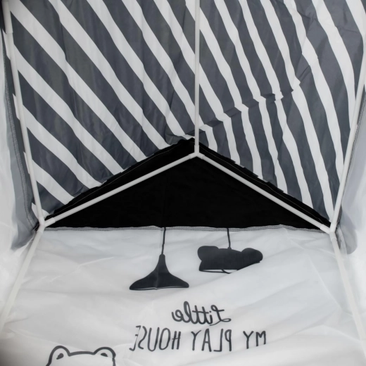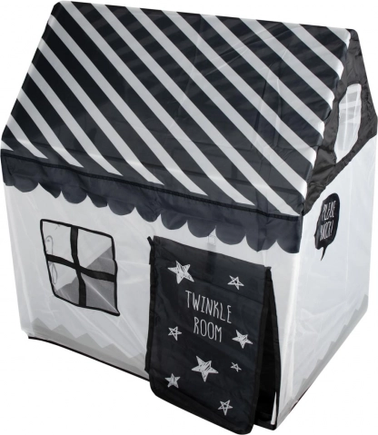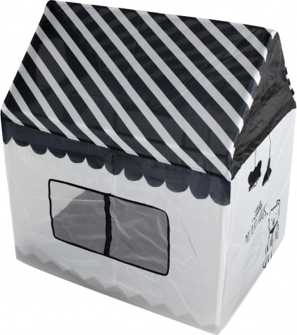 Krásný hrací domek zajistí vašemu dítěti spoustu zábavy i prostor pro odpočinek. Domek tvoří pevná dřevěná konstrukce s textilními stěnami a střechou, okna a dveře jsou vybavené záclonkami. Probouzí představivost a umožňuje Vám trávit čas spokojeně o samotě nebo ve větší skupině bez věkového omezení. Velikost domečku umožňuje pobývání více dětí současně nebo do něj umístit mnoho plyšáků, polštářů či jiných doplňků. Výrobek je ideální pro použití v interiéru i exteriéru, například na zahradě nebo v parku.