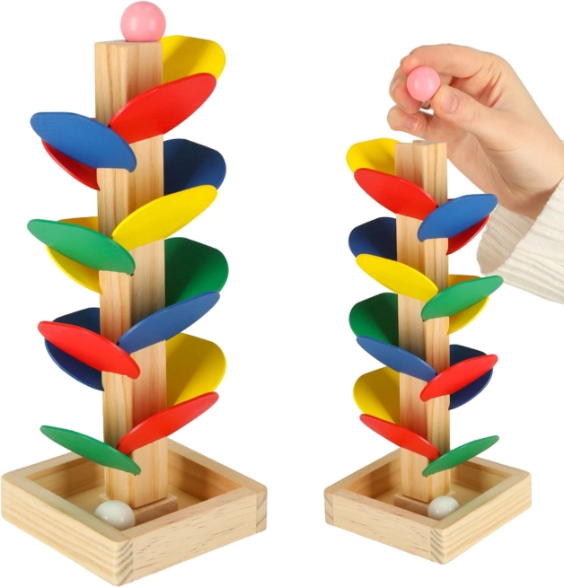 Objevte dřevěný kuličkový strom MONTESSORI – hravou pomůcku, která děti vede k objevování barev, zvuků a fyziky. Spusťte kuličku z vrcholu a sledujte, jak po barevných listech klouže dolů, přičemž rozvíjí jemnou motoriku a koordinaci oko–ruka. Vyrobeno z přírodního dřeva, kompaktní výška 21 cm a skvělý dárek pro zvídavé děti.