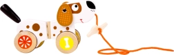 Pes má tichý chod díky gumovým kroužkům na kolech, což zajistí klidném pohybu po jakémkoli povrchu. S ocasem, který se vesele kýve při táhnutí, a kostí, jako odměnou pro pejska, nabízí nekonečné možnosti pro hru a zábavu.