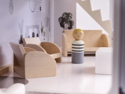 Každá místnost je vybavena stylovým nábytkem – od koupelny přes jídelnu s kuchyňským koutem až po ložnici a pracovní koutek. Domeček je ideální pro společnou hru sourozenců, rozvíjí sociální role a přirozeně podporuje jemnou motoriku i fantazii.