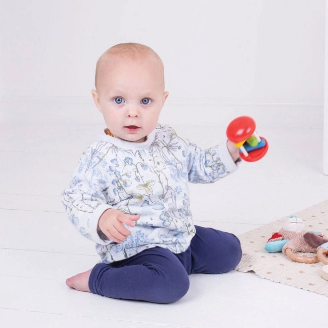 Duhový válec Bigjigs Baby je nadčasové dřevěné chrastítko, které zaujme sytými barvami i příjemným zvukem. Tři barevné bloky se při kutálení nebo třesení houpou a jemně narážejí do podpěr, takže dítě motivují k dalšímu zkoumání, uchopování a pohybu.