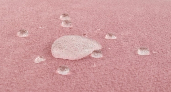 Sametově hebký materiál CLEANABOO nevsakuje okamžitě tekutiny – rozlité nápoje se drží v kapkách a snadno se setřou.