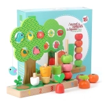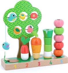 Tato kvalitní dřevěná hračka spojuje zábavu a učení v jednom. Děti skládají a navlékají mrkev, pórek, rajčátka a další tvary na očíslované kolíky 1–5, čímž si přirozeně osvojují počítání i třídění podle barev a velikostí. Součástí je i stromek s posuvnými prvky pro objevování a trénink koordinace oko–ruka.