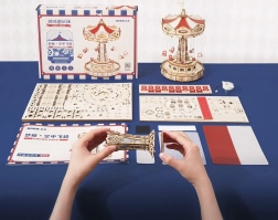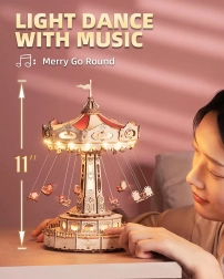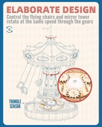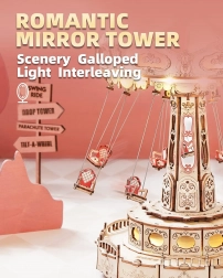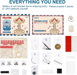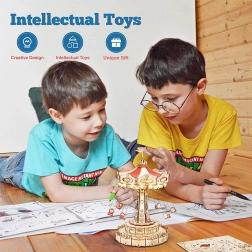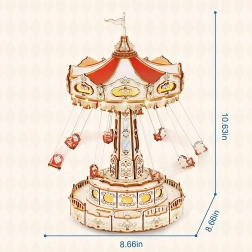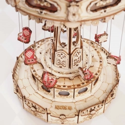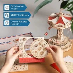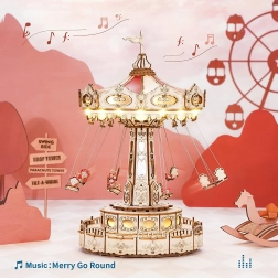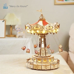 Tato 3D skládačka hrací skříňky představuje elegantní řetízkový kolotoč s bohatou výzdobou v přírodních a barevných tónech. Po sestavení se kolotoč roztočí díky motoru, rozzáří se LED osvětlením a přehraje melodii Merry Go Round, která vykouzlí nostalgickou, romantickou atmosféru. Sada je dodávána v nesloženém stavu s podrobným návodem – ideální projekt pro víkendové tvoření.