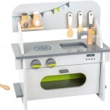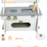 Kompaktní dětská kuchyňka z FSC certifikovaného dřeva přináší vše pro realistickou hru na vaření: troubu s magnetickými dvířky, otočné knoflíky s klikáním a bohaté příslušenství včetně hrnce s poklicí, solničky a pepřenky. Díky chytré konstrukci ji složíte i rozložíte bez použití nářadí.