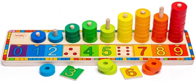 Číselné řady 0–9 a stohovací kroužky vedou děti k přirozenému pochopení množství, pořadí a základů počítání.