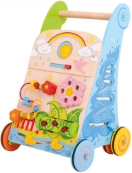 Podpořte první krůčky i jemnou motoriku s tímto dřevěným aktivním chodítkem inspirovaným přírodou. Nabízí multifunkční interaktivní prvky (posuvník slunce/měsíc, rotující květinu, korálkový labyrint, třídění tvarů) a robustní rukojeť s pestrobarevnými kolečky pro stabilní a radostný pohyb.