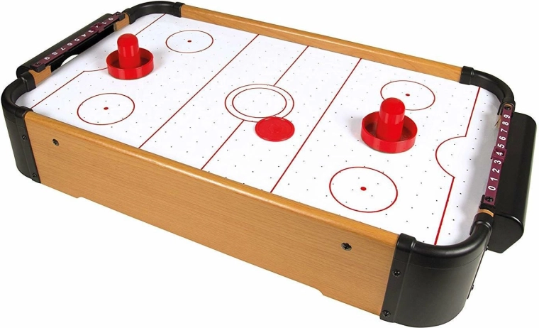 Stůl má pevný dřevěný rám, integrované branky, manuální posuvné počítadlo skóre na obou stranách a dodává se se dvěma táhly a pukem. Hra rozvíjí koncentraci, koordinaci oko–ruka a fair play.