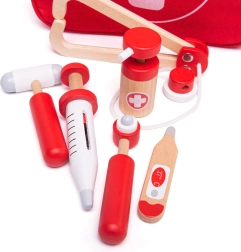 Přenosný doktorský kufřík pro malé lékaře obsahuje 10 pečlivě zpracovaných nástrojů z dřeva a textilu. Podporuje kreativní a nápaditou hru, učí péči a empatii a díky praktické tašce na zip je ideální i na cesty. Vyrobeno z kvalitních a bezpečných materiálů, vhodné od 3 let.