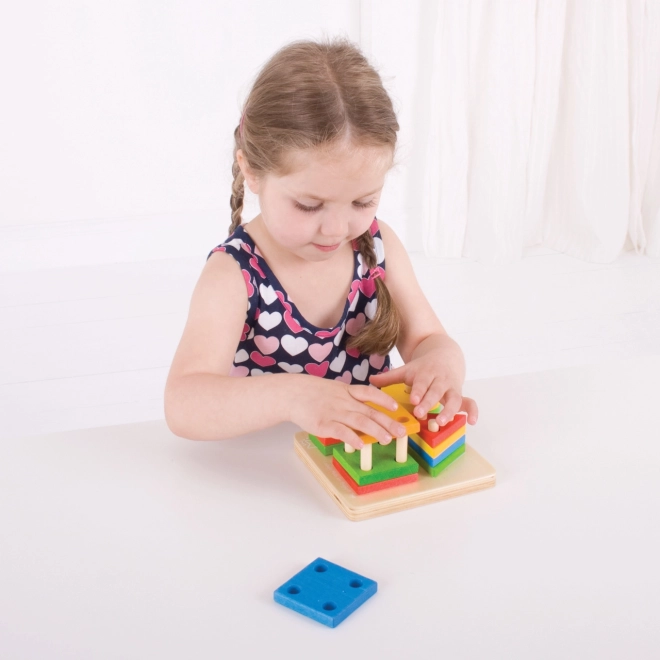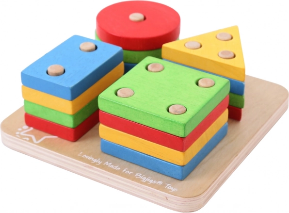 Tato dřevěná vkládačka se základnou s kolíky a pestrobarevnými geometrickými tvary (kruhy, čtverce, trojúhelníky, obdélníky) nabízí dětem radost z objevování a učení. Při nasazování jednotlivých dílků si děti procvičí úchop, koordinaci ruka–oko i logické myšlení, zároveň přirozeně trénují rozlišování barev a tvarů a první počítání.