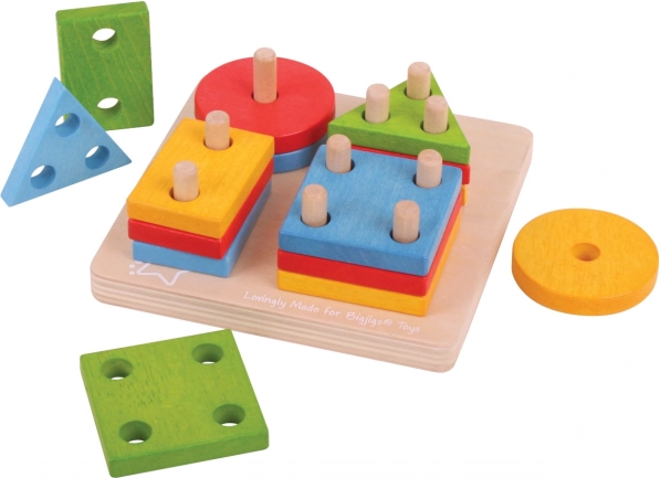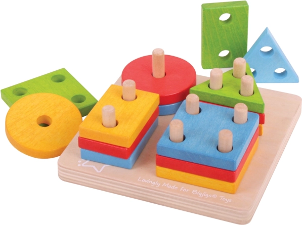 Pestrobarevné kruhy, čtverce, trojúhelníky a obdélníky podporují rozlišování barev a tvarů. Kolíky a dílky pomáhají s raným počítáním.