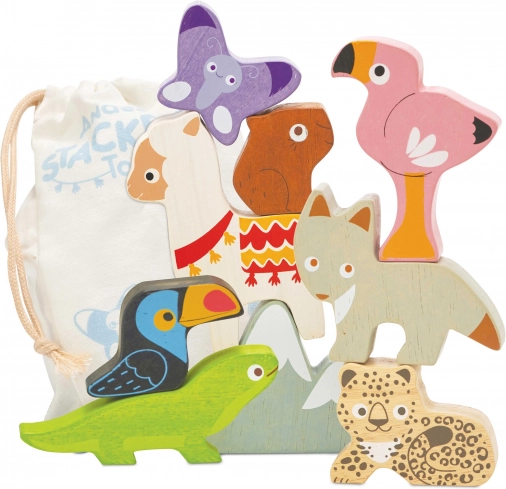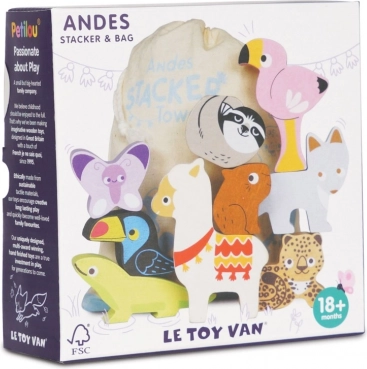 Tato andská stohovací věž přináší dětem dobrodružství z hor přímo do dětského pokoje. Sada obsahuje robustní dřevěné figurky zvířat (např. lama, plameňák, tukan, ještěrka, motýl, lenochod) a dílek hory, které lze stavět, vyvažovat a kombinovat do zábavných sestav.