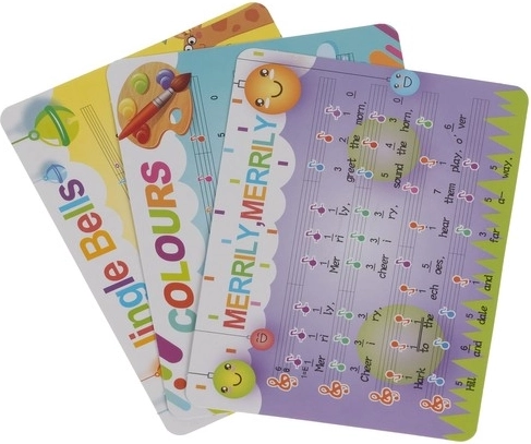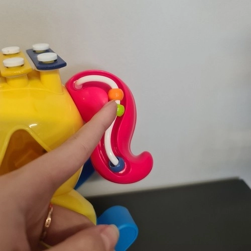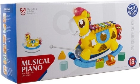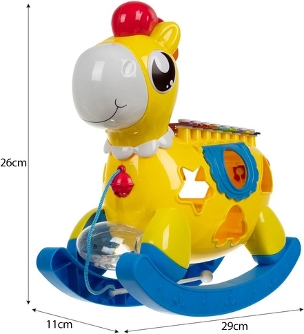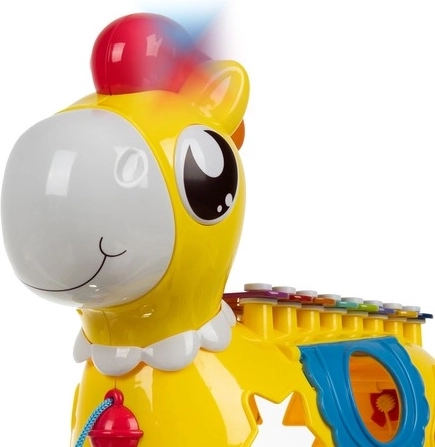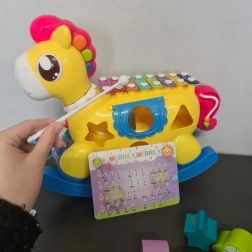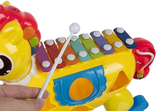 Na hřbetu koníka je xylofon, které jistě osloví děti, které mají rády zvuky a hudbu. K sadě je připevněna speciální hůl pro hraní. K hračce se připevňuje šňůrkou, aby ji dítě neztratilo. Navíc jsou zde kartičky na naučení se hrát na xylofon - 3 kartičky se 6 písničkami.