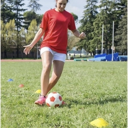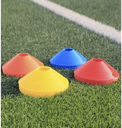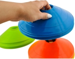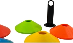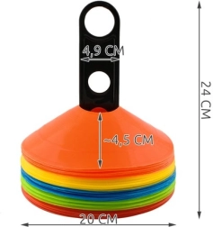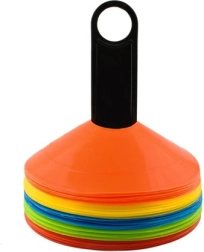 Sada nízkoprofilových tréninkových kuželů je ideální pro fotbal, atletiku, fitness i školní tělocvik. Pět sytých barev (žlutá, oranžová, červená, zelená, modrá) umožňuje jasně vyznačit zóny, dráhy a cvičební stanoviště, což zvyšuje bezpečnost a přehlednost tréninku.