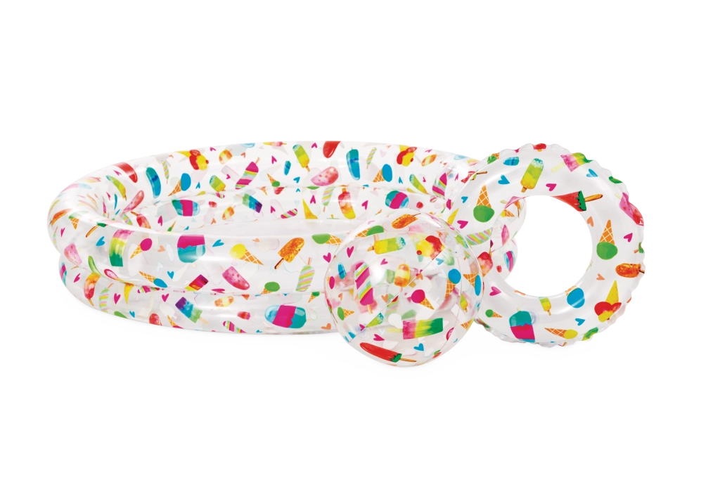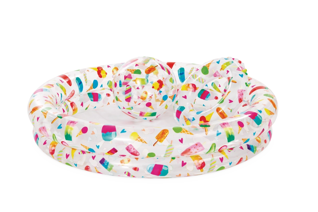 Sada obsahuje nafukovací bazén, plovací kruh a plážový míč – děti se mohou koupat, chytat míč i učit se jistotě ve vodě.