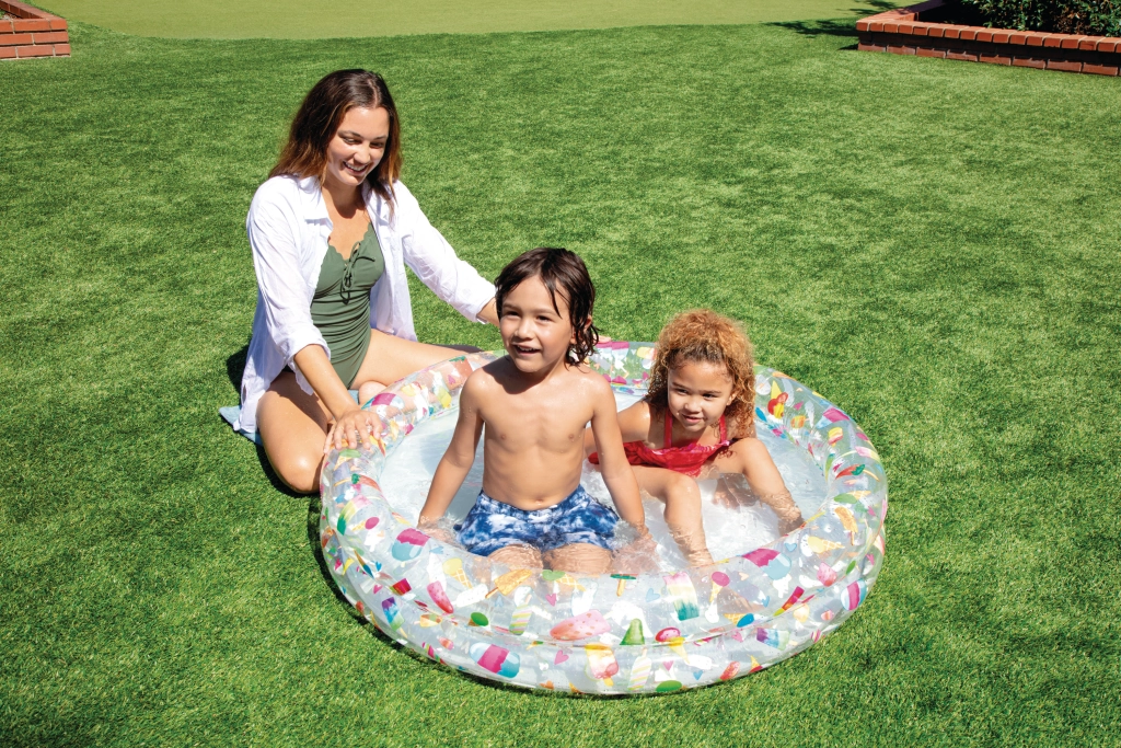 Užijte si léto na zahradě s tímto kompaktním dětským bazénem se vzorem ovoce a praktickou sadou: nafukovací bazén, plovací kruh a plážový míč. Vyrobeno z odolného testovaného vinylu, se zpětnou pojistkou na ventilku pro bezpečné používání. Ideální pro osvěžení a vodní hrátky dětí od 2 let (vždy pod dohledem dospělé osoby).