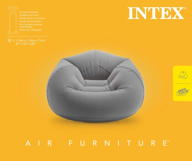 Díky nafukovací konstrukci je křeslo ideální do obýváku, studentského pokoje, na chatu i do kanceláře pro relax zónu. Snadno se nafukuje i vyfukuje, takže jej bez námahy přenesete a uložíte. Šedé provedení se hodí k většině dekorů a zvýrazní čisté linie moderního bydlení.