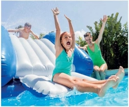 Nafukovací skluzavka INTEX Kool Splash promění každý bazén v centrum letní zábavy. Díky rozměrům cca 3,33 × 2,06 × 1,17 m poskytuje dostatek prostoru pro pohodlný a plynulý skluz přímo do vody. Integrované ruční postřikování pomocí připojené zahradní hadice udržuje plochu příjemně mokrou a zvyšuje rychlost i komfort při skluzu.