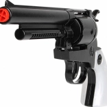 Černé tělo, bílá střenka a dlouhá hlaveň vytvářejí ikonický styl westernového koltu, ideální pro hry a kostýmy.