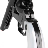 Tento kovbojský revolver na kapslíky přináší realistický vzhled a odolné zpracování. Díky kombinaci kovu a plastu je lehký do ruky, přitom dostatečně bytelný pro časté hraní. Dlouhá hlaveň a bílá střenka podtrhují klasický vzhled historického revolveru.