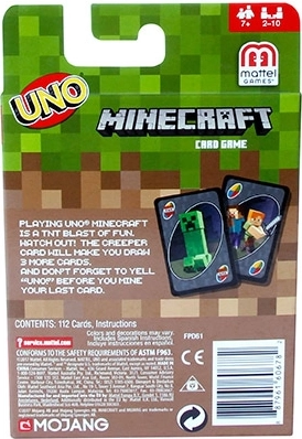 UNO Minecraft spojuje klasickou dynamiku UNO s ikonickým světem MINECRAFT. Cílem je co nejrychleji odhodit všechny své karty, přiřazovat barvy a čísla a chytře používat akční karty. Edice Minecraft přidává unikátní kartu Creeper – jakmile ji líznete a ukážete, ostatní hráči si musejí vzít 3 karty.
