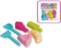 Praktická souprava obsahuje lopatku a hrabičky pro snadné nabírání a modelování písku a čtyři formičky ve tvaru oblíbených sladkostí. Odolný plast se snadno čistí a je ideální na hřiště, zahradu i pláž.