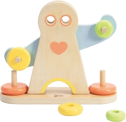 Děti posouvají kroužky po ramenech figurky a sledují, jak se mění vyvážení. Přirozeně tak chápou rozdíl mezi lehkým a těžkým a procvičují logické uvažování.