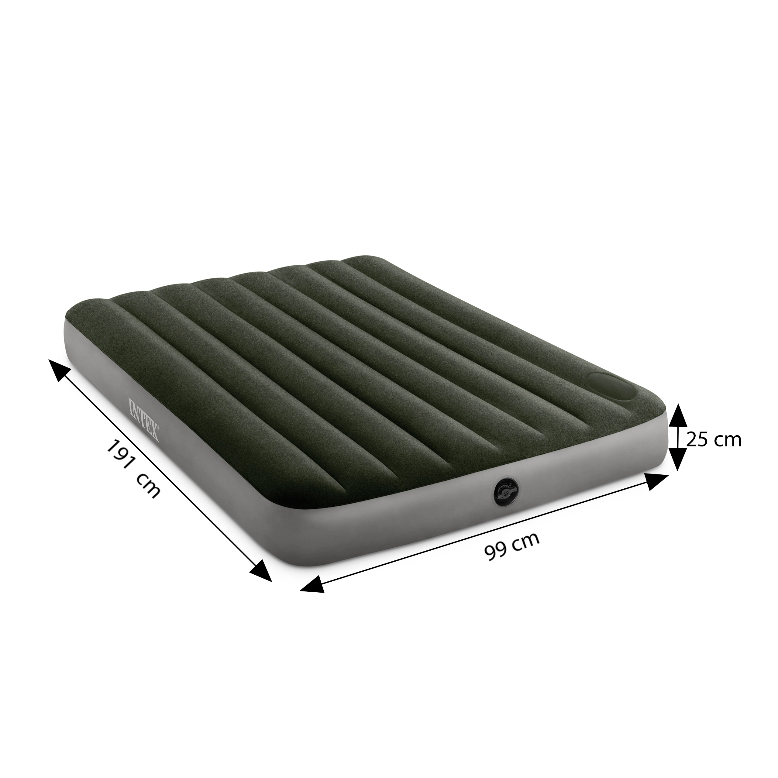 Rozměry 191 × 99 × 25 cm poskytují komfortní prostor pro jednu dospělou osobu. Kvalitní PVC se snadno udržuje a voděodolný flock zvyšuje komfort i životnost. Součástí balení je i záplata pro rychlé opravy.