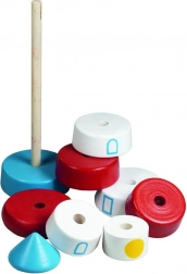 Skládání na kolík trénuje koordinaci oko–ruka, třídění podle tvaru a velikosti i vnímání barev. Ideální první didaktická hračka pro nejmenší.