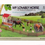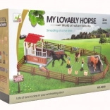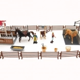 Výběh s ohradou, 2 figurky koní, ošetřovatelé, příslušenství pro péči (sedla, krmení, čistící a sprchové doplňky)