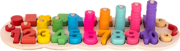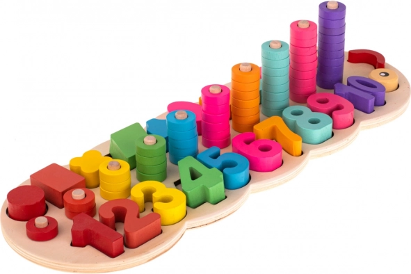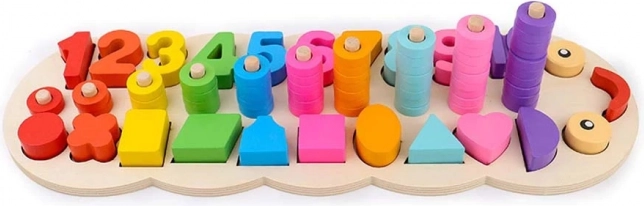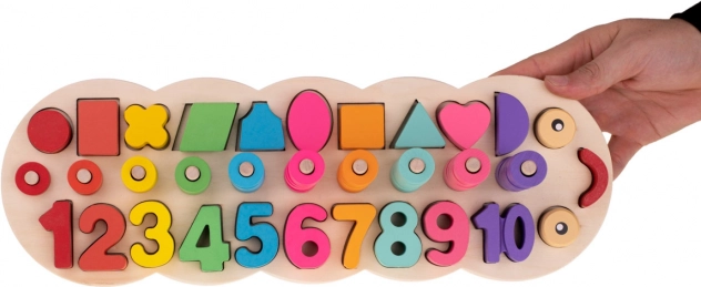 Dřevěná vzdělávací hračka Stonožka nabízí skvělou příležitost pro rozvoj různých dětských dovedností. Obsahuje základnu ve tvaru stonožky spolu s deseti různobarevnými tvarovanými kostkami, čísly od 1 do 10 a 55 barevnými kroužky. Děti mohou přiřazovat tvary do odpovídajících otvorů, čímž si zlepšují motoriku a koordinaci.