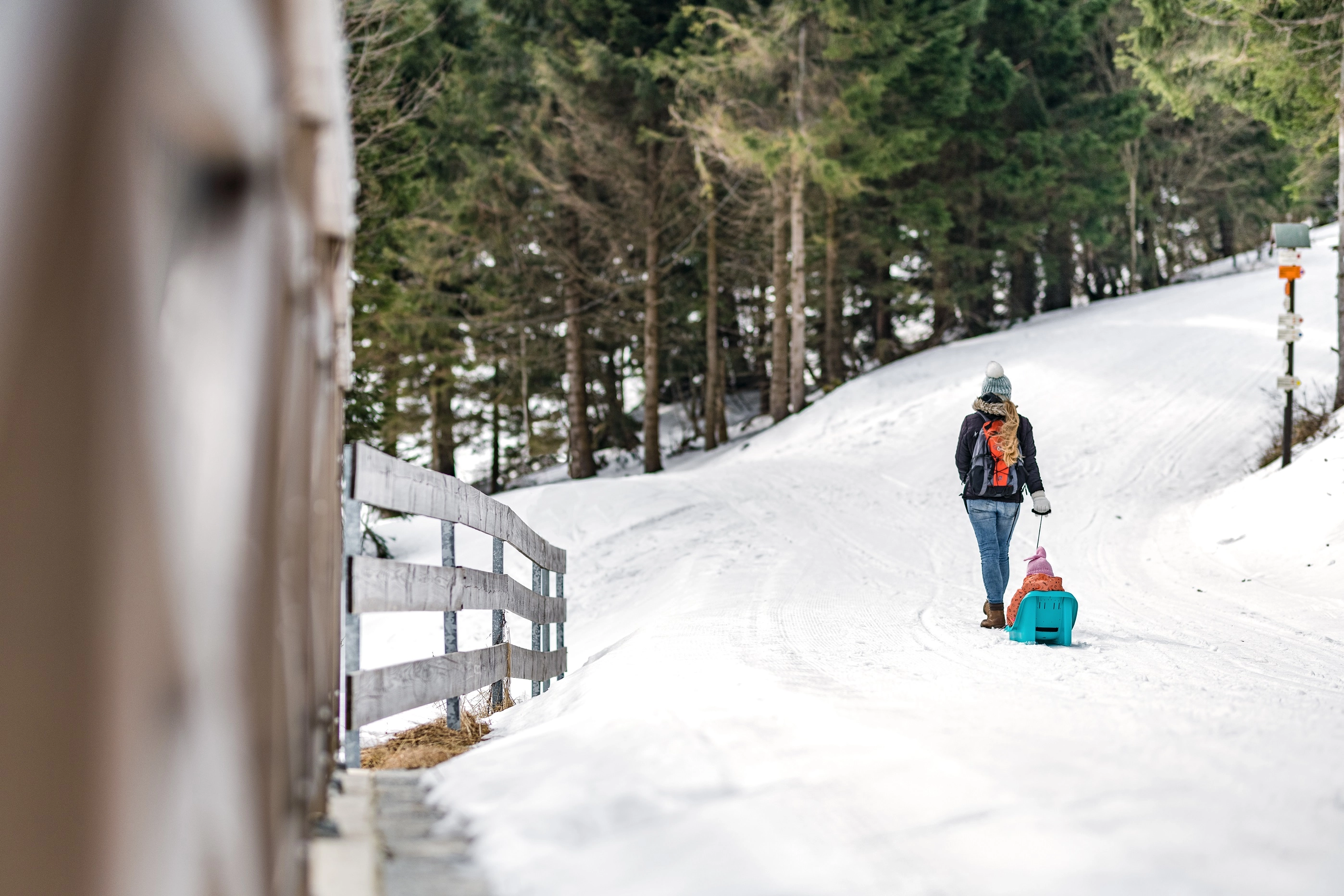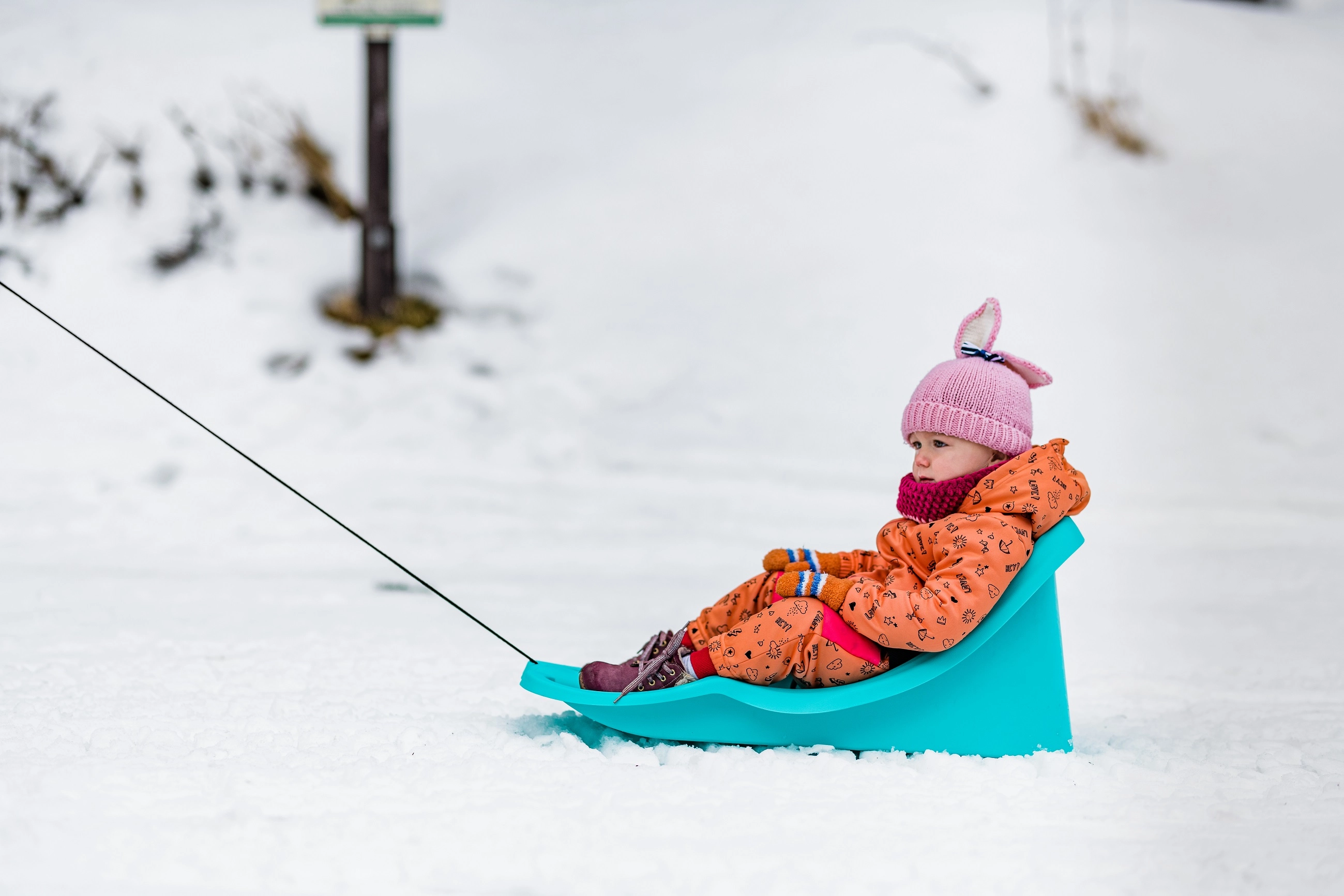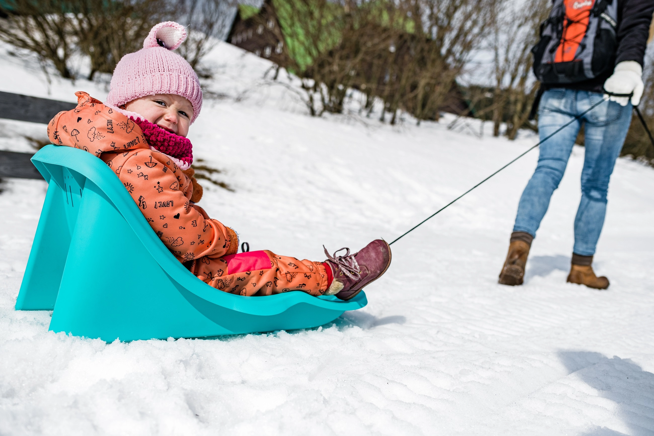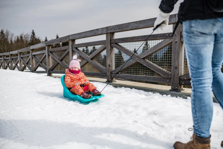 Praktické tažné lano s madlem umožní rodičům snadno táhnout boby po sněhu i na delších trasách.