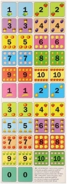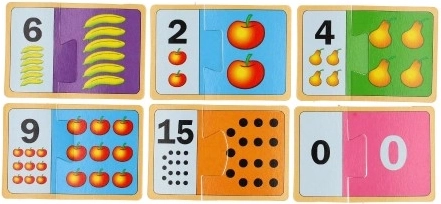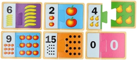 Děti párují číslice s odpovídajícím počtem obrázků ovoce a teček, čímž si přirozeně osvojují počítání a rozpoznávání množství.