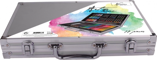 Souprava obsahuje 79 kusů, včetně vodových barev, pastelek, štětců, gumy a ořezávátka pro veškeré umělecké potřeby.