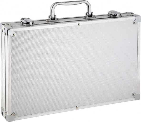 Tento kovový kufřík je vybaven pevným držadlem a bezpečnými přezkami, což umožňuje snadné přenášení a bezpečnou organizaci všech potřeb.