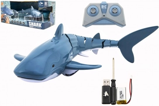 - Balení obsahuje: žralok, dálkové ovládání, USB nabíjecí kabel, šroubovák, 2x AA baterie
