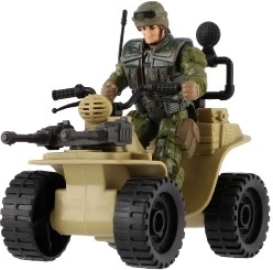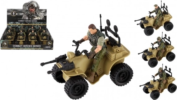 Tato čtyřkolka nabízí realistické detaily včetně kamuflážního oblečení vojáka a velkých černých pneumatik.