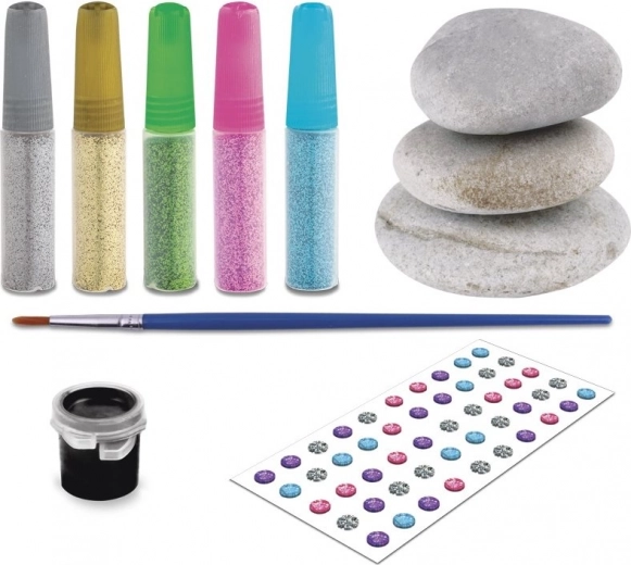 Tři přírodní hladké kameny, štětec, černá barva, pět metalických odstínů a třpytivé kamínky – začněte tvořit hned po rozbalení.