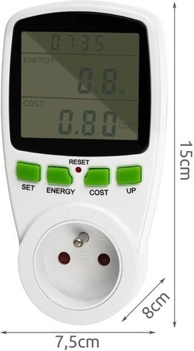 Měřič má velký, čitelný displej, který umožní přesné čtení údajů jako: napětí, proud, frekvence, výkon, minimální výkon, maximální výkon, aktuální výkon, spotřebovaná energie a náklady na spotřebu.