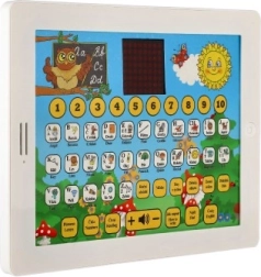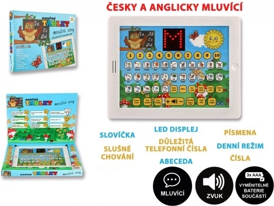 Dětský vzdělávací tablet TEDDIES Moudré sovy je ideální interaktivní pomůcka pro předškoláky i mladší školáky. Díky dotykovému ovládání a přehlednému LCD displeji si děti hravou formou procvičí abecedu, čísla, základní slovní zásobu v češtině i angličtině a osvojí si pojmy jako roční období, měsíce a dny v týdnu. Nechybí ani užitečné informace z dětské etikety a důležitá telefonní čísla.