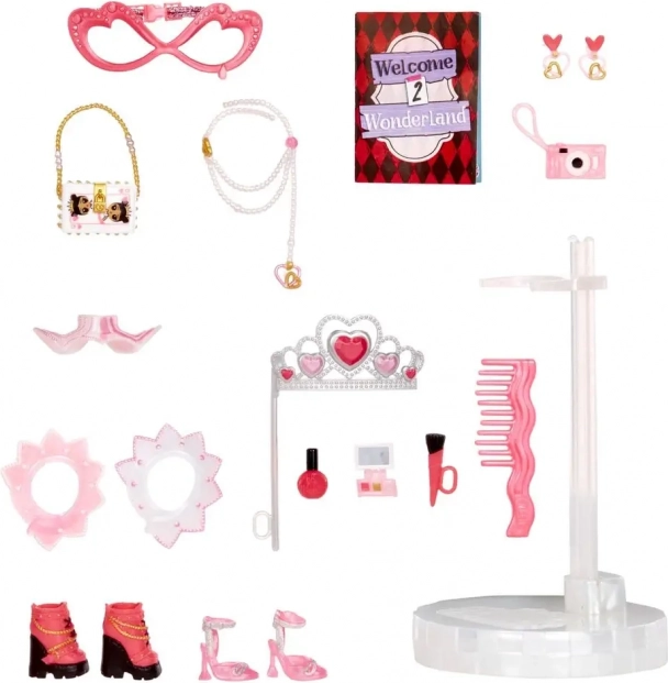 V balení najdeš více než 15 překvapení včetně doplňků, bot, šperků, brýlí a korunky. Obal navíc snadno rozložíš na praktickou hrací scénu – ideální pro okamžité hraní a vystavení panenky.
