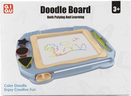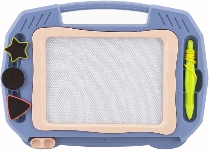 Objevte zábavný způsob, jak podpořit dětskou kreativitu – magnetická kreslicí tabulka v modré barvě s perem na provázku a třemi magnetickými razítky (kolečko, hvězdička, trojúhelník). Jedním tahem posuvníku obrázek snadno smažete a můžete tvořit znovu a znovu.